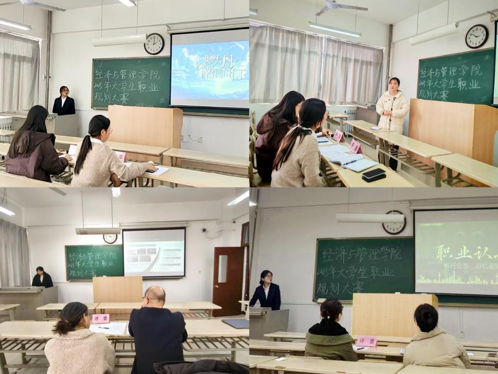 为进一步强化学生职业生涯规划意识,培养学生职业发展规划能力与创新创业能力,2025年11月26日下午,经济与管理学院在博文楼b501、b503、b505教室举办“筑梦青春在四方,规划启航引未来”2025年大学生职业规划大赛院级展示环节。经过各年级选拔推荐,共有成长赛道53名选手以及就业赛道4名选手进入到学院展示环节。学院党委书记陈璐、副书记刘微雨、副处级组织员郭薇、辅导员肖欢、刘念念、赵沙俊一共同担任了本次院级比赛的评委。