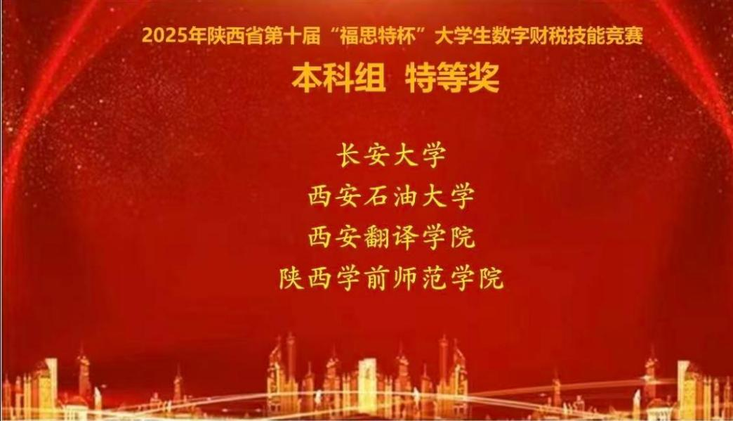 近日,由陕西高等学校教学指导委员会工商管理类工作委员会主办、西北政法大学承办的2025年陕西省第十届“福思特杯”大学生数字财税技能竞赛圆满落幕。我院23级财务管理本科3班杨雨桐、24级财务管理本科1班张裕欣、向佳敏、杨雨欣四位学子组建的“沐雨成佳队”,凭借扎实的专业功底、娴熟的实操技能与默契的团队协作,在全省多所高校参赛队伍中脱颖而出,斩获省级特等奖,为学校赢得了荣誉。