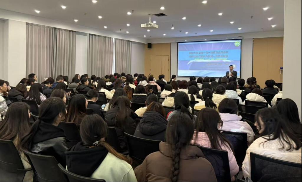 参观结束后,爱菊集团党委书记刘东萌为师生们作了题为《服务大局 助推一带一路建设走深走实,创新发展 促进内外贸易一体高质发展》的专题报告。刘书记结合集团多年发展实践,从粮食安全战略背景切入,深入剖析了爱菊集团在跨国经营中的财务管理创新——在哈萨克斯坦基地建设中如何通过汇率风险管理降低跨境交易成本,在全产业链布局中如何通过预算管理实现资源优化配置,在品牌建设中如何通过财务杠杆撬动市场拓展。他强调,“现代企业的财务管理早已超越单纯的记账核算,更是企业战略落地的核心支撑。”报告尾声,刘书记与学生们亲切互动,针对“跨境粮贸的税务筹划”“农业企业的补贴资金管理”等专业问题逐一解答,现场氛围热烈。