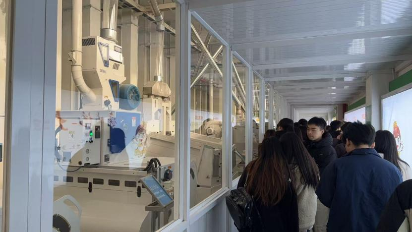 学生分批次参观爱菊集团面粉加工中心、油脂加工中心、爱粮节粮科普馆。在爱菊集团油脂精炼车间,现代化生产设备有序运转,从原料筛选到精炼提纯再到成品封装的全流程一目了然。讲解员详细介绍了车间的智能化管控系统,通过实时数据监测屏,师生们直观看到生产进度、能耗数据、质量检测结果等关键信息的动态更新。带队老师结合车间运营数据,现场为学生解读了固定资产折旧、能耗成本分摊等财务管理知识点,让抽象的专业术语转化为具象的生产实践。