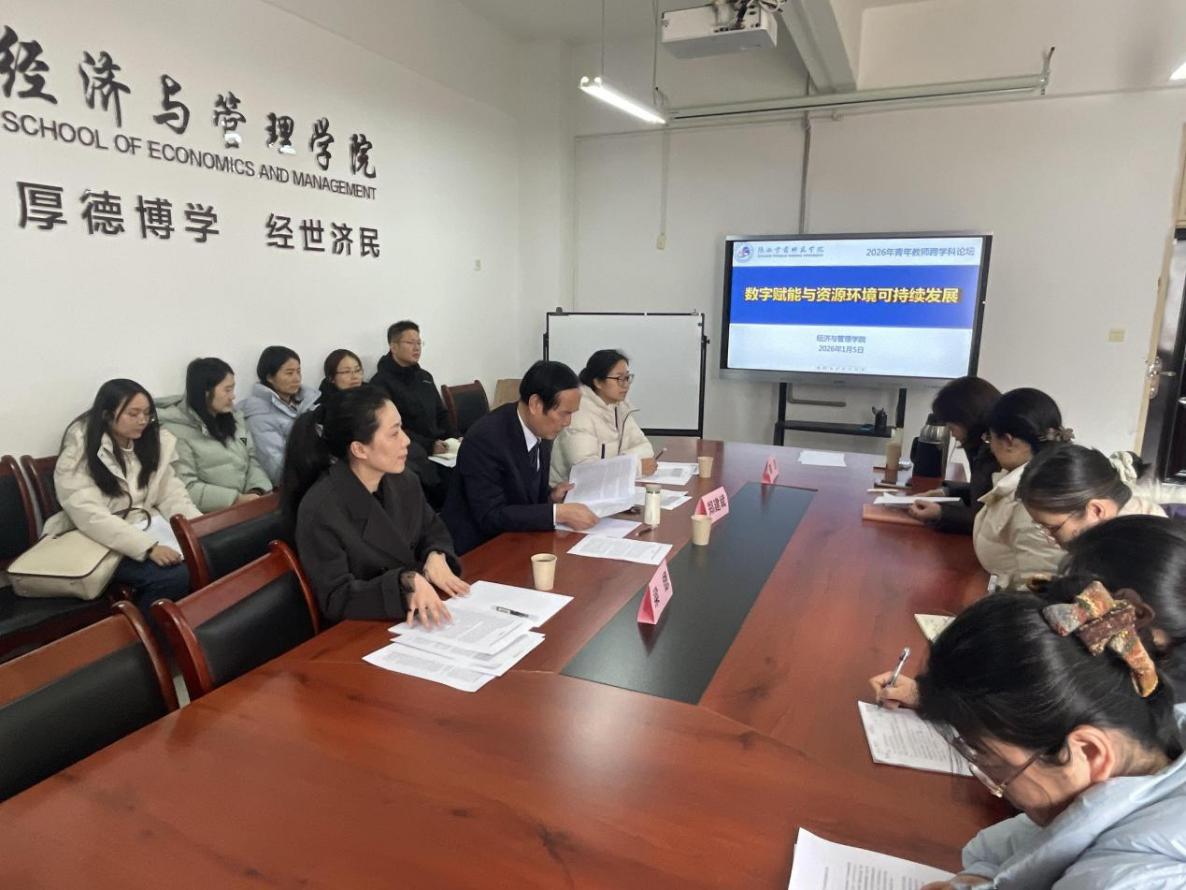 为切实提升青年教师学术能力,助力高质量科研成果产出,2026年1月5日下午,经济与管理学院在博文楼B411会议室成功举办2026年度第二期青年教师跨学科论坛。本次论坛以“数字赋能与资源环境可持续发展”为主题,由学院副院长徐晗主持,特邀陕西师范大学、西北大学、长安大学三所高校专家学者莅临指导,为青年教师搭建起跨领域学术交流、科研指导的优质平台。